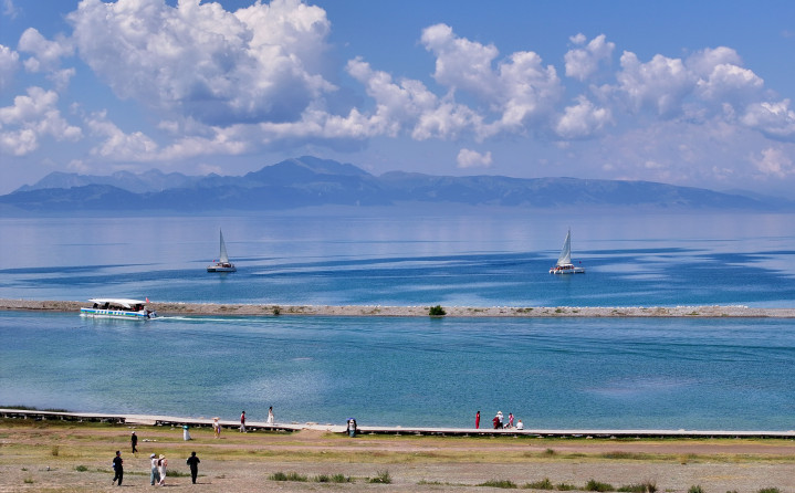 7月17日,游客在新疆博尔塔拉蒙古自治州赛里木湖景区游玩赏景。新华社发(张利民 摄)