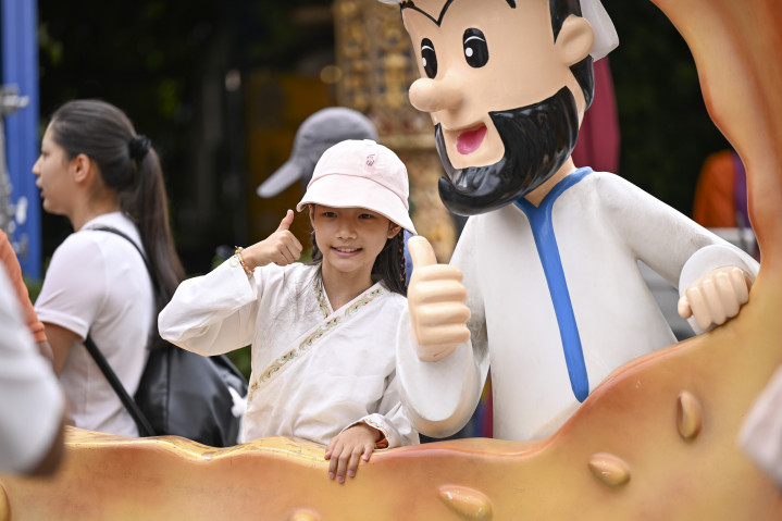 8月21日,小游客在乌鲁木齐大巴扎步行街拍照留影。自7月以来,大巴扎步行街日均接待游客约20万人次。新华社记者 王菲 摄
