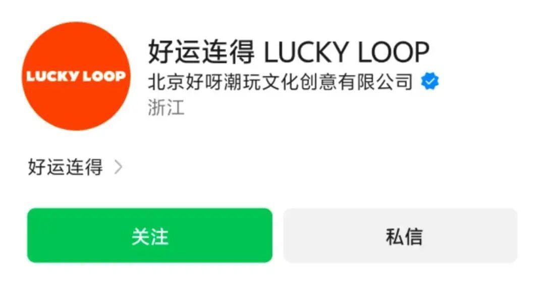 “好运连得 LUCKY LOOP”官方微信公众号已于今年1月完成注册认证,但并未使用,账号主体为北京好呀潮玩文化创意有限公司。