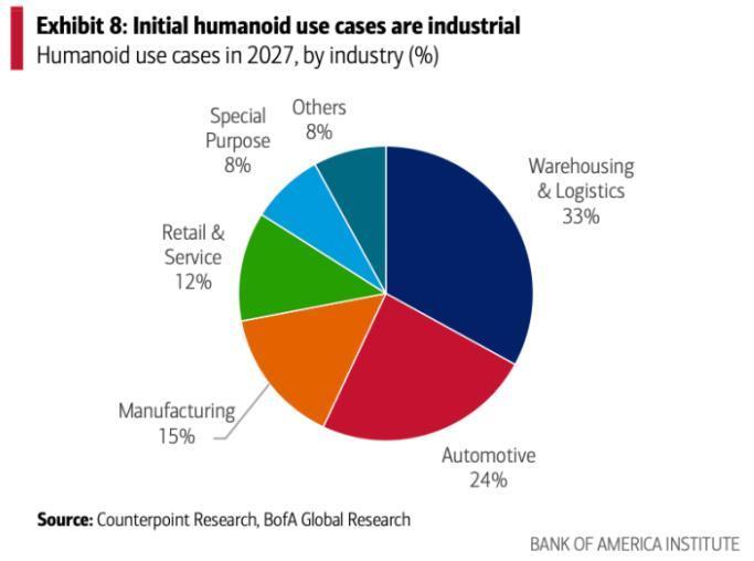 Counterpoint Research数据显示,到2027年,72%的人形机器人应用场景将集中在仓储物流(33%)、汽车(24%)和制造业(15%)行业。零售和服务业的应用仅占12%。家用人形机器人场景将是21世纪40年代的故事,而卸货机器人则是2027年。