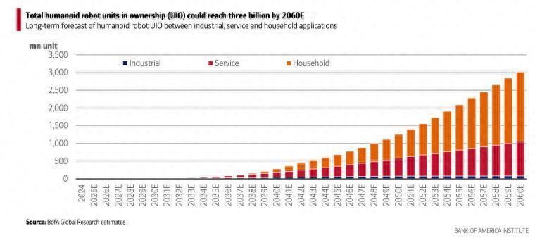 美银估计,到2060年,全球人形机器人数量将达到30亿台,按人均计算,将超过全球约15亿辆汽车的保有量。其中,估计62%的人形机器人(约20亿台)将进入居民家中。
