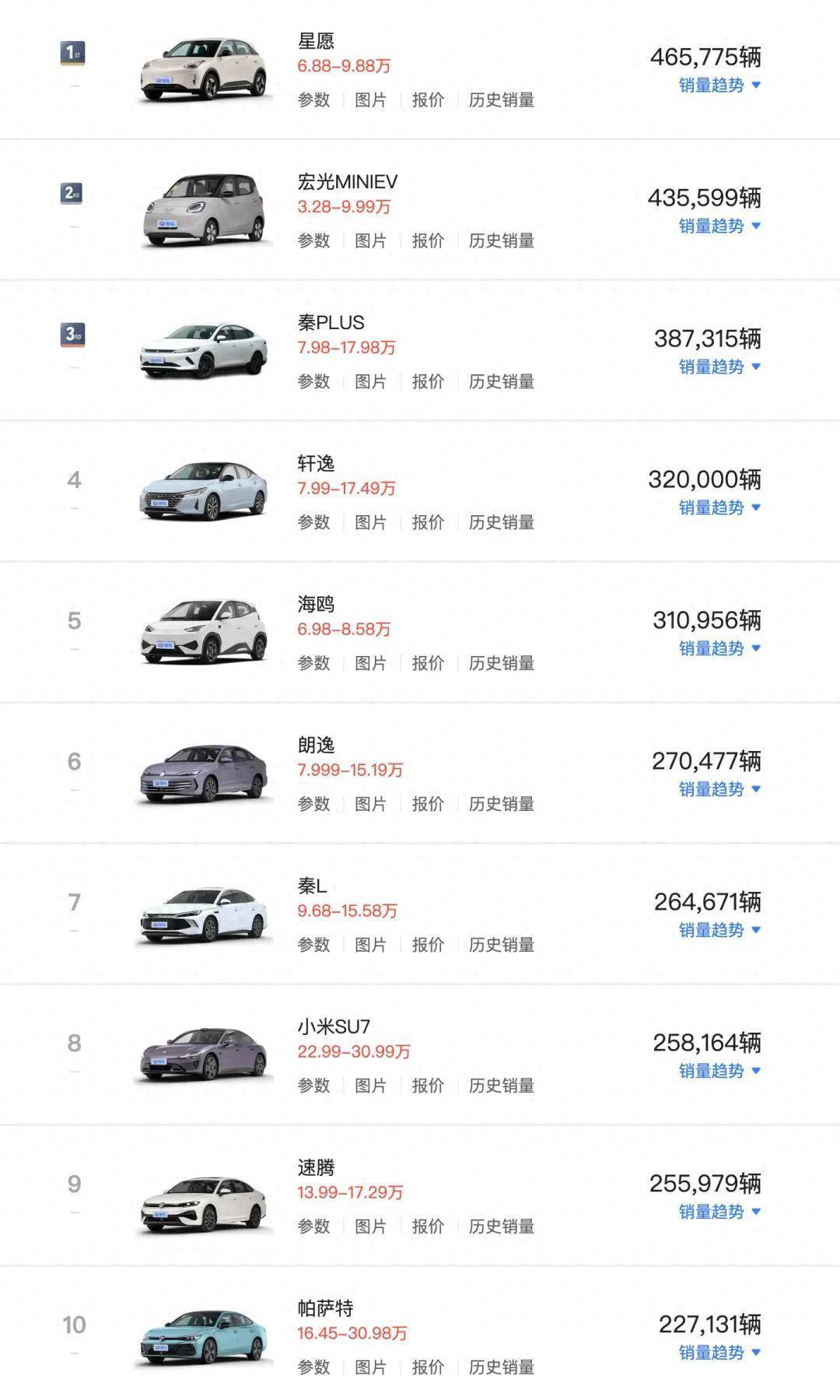 日产轩逸全年销量320,000辆,是销量最高的合资燃油车,但销量同比下滑,靠口碑与成本优势维持家用基本盘,东风日产即将推出新一代轩逸,有望扭转市场。大众展现出合资燃油的韧性,朗逸/速腾/帕萨特进入前十。
